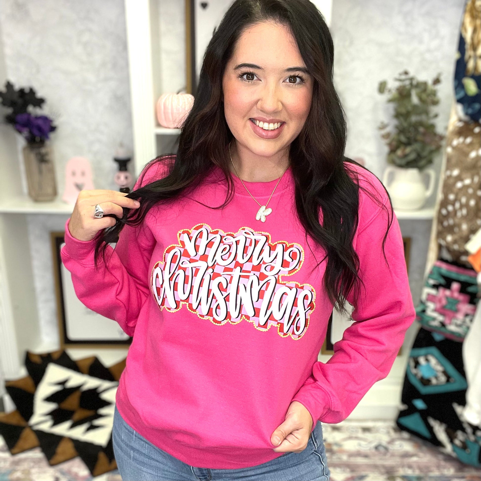 Get cozy and festive with the Merry Christmas Checkered Graphic Crewneck! Featuring a fun checkered pattern and holiday message, this playful sweatshirt adds cheer to any winter outfit. Perfect for lounging by the fire or holiday parties, it keeps you comfy while spreading seasonal joy.